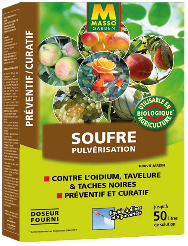 Traite par contact et par vapeur les maladies des fruits et légumes, des rosiers et de la vigne. Il agit preventivement et curativement sur l’oïdium, les tâches noires sur rosiers, les tavelures sur fruits et les maladies.